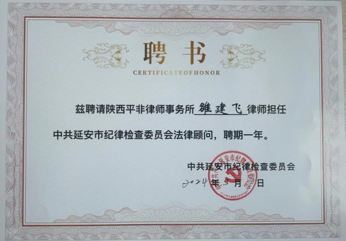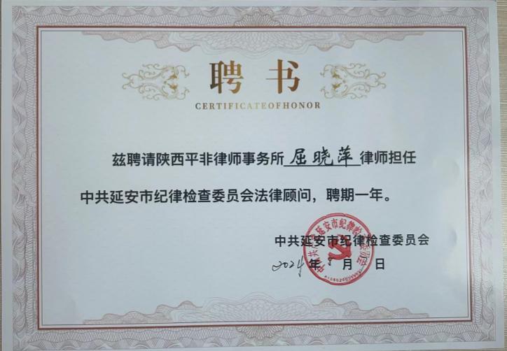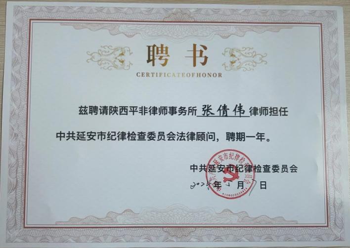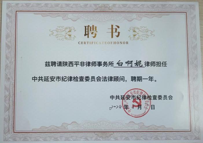 5月7日,中共延安市纪律检查委员会与陕西平非律师事务所签订常年法律顾问协议,聘请我所律师白啊妮、雒建飞、屈晓萍、张倩伟为延安市纪律检查委员会常年法律顾问,并向法律顾问团队颁发聘书。