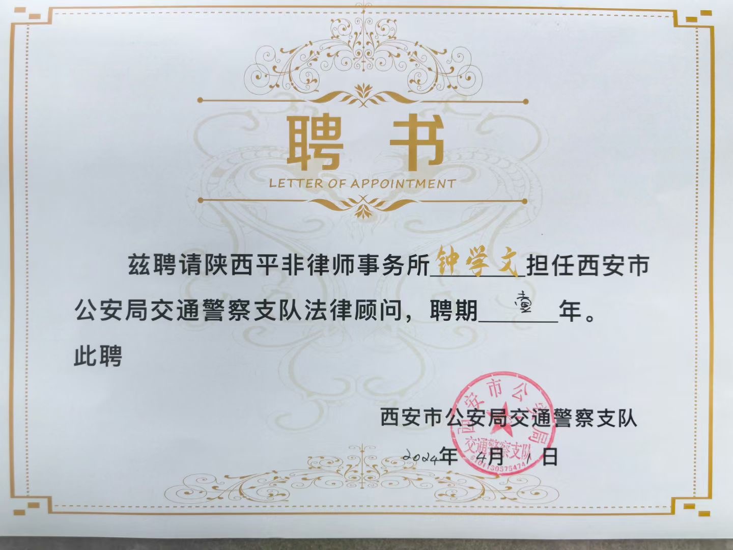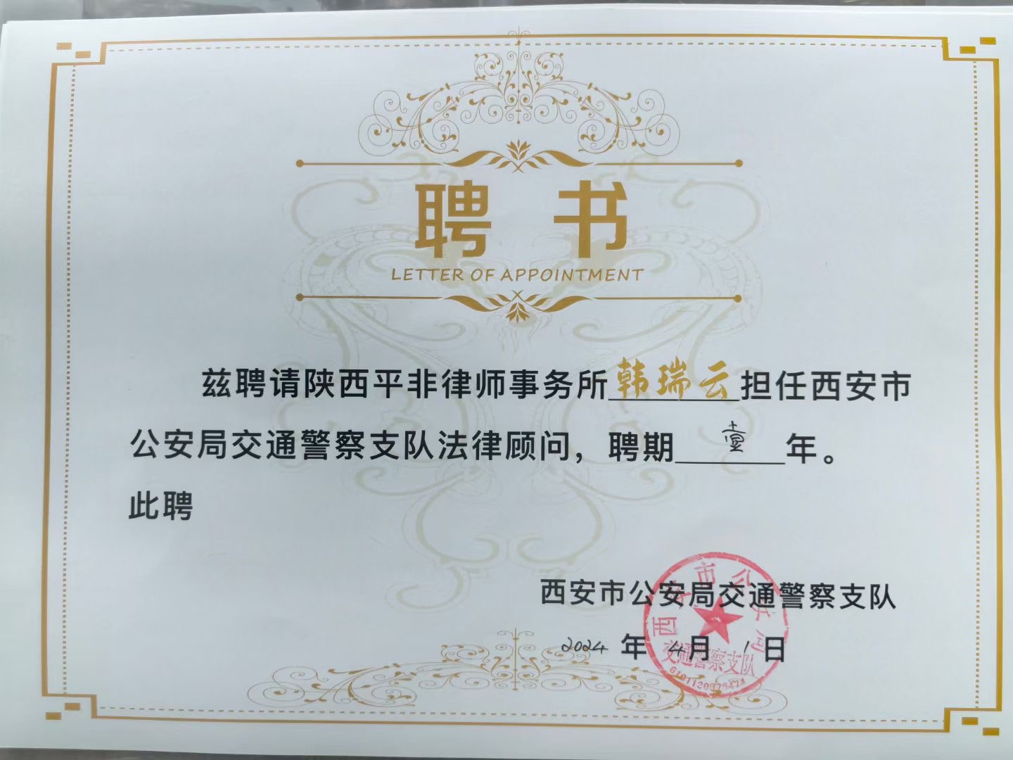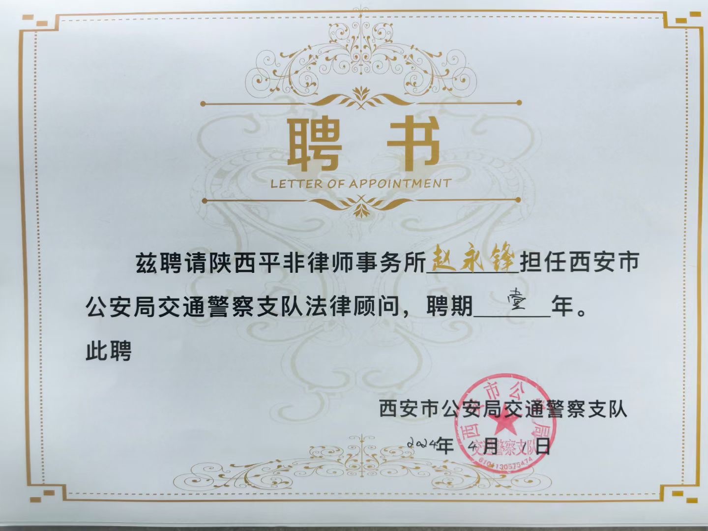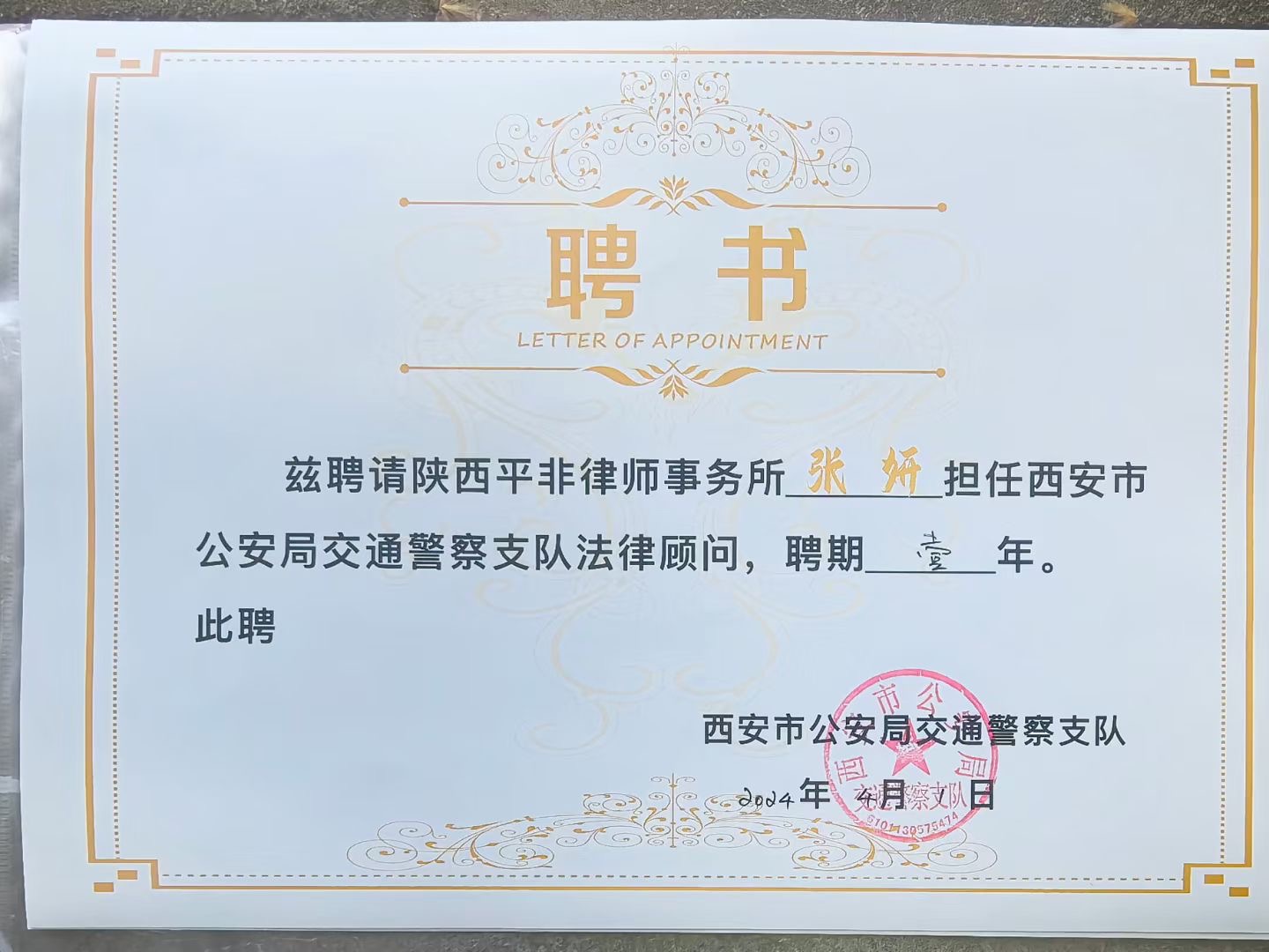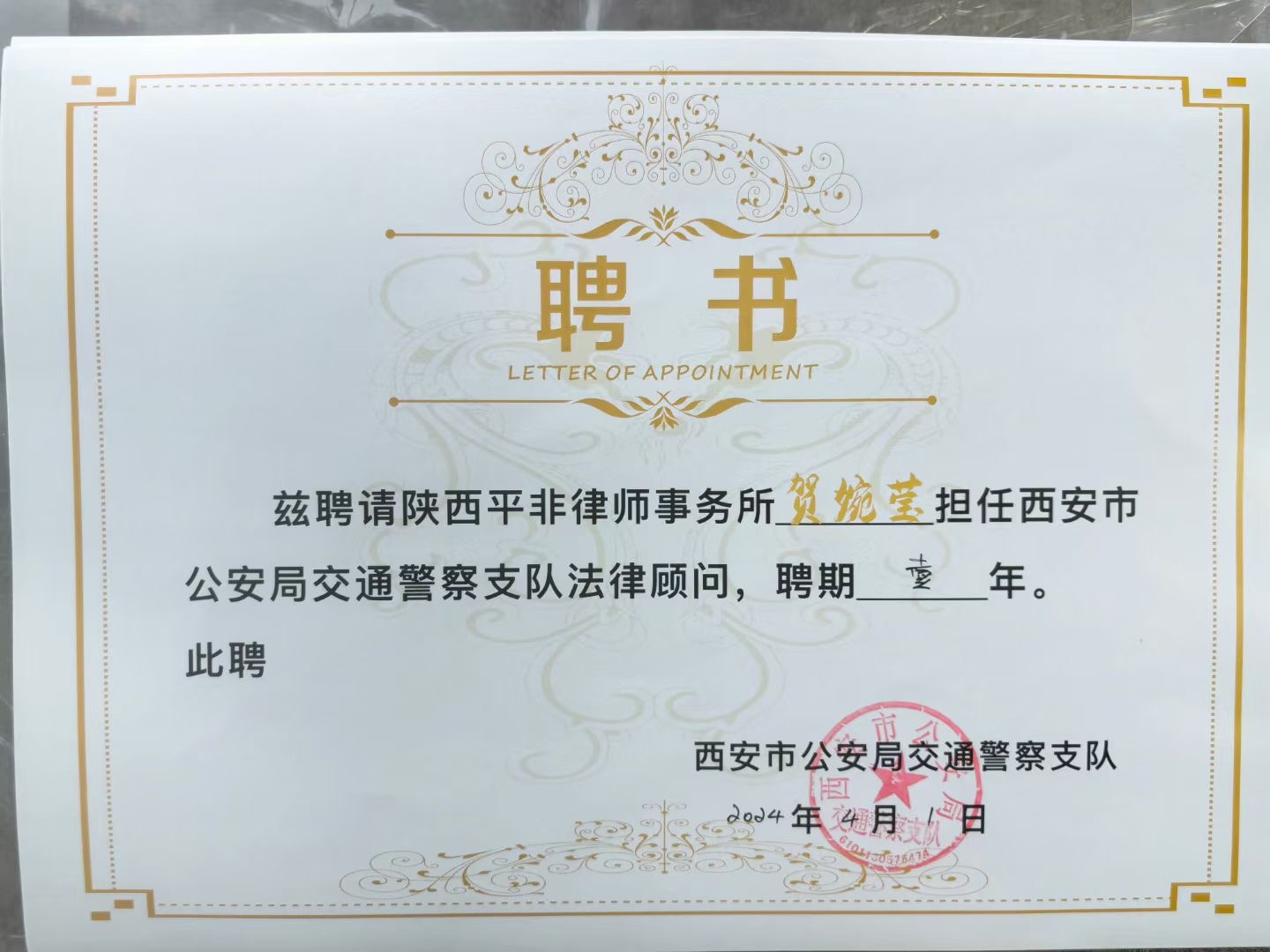 近日,西安市公安局交通警察支队与陕西平非律师事务所达成合作,聘请我所作为支队常年法律顾问,同时向聘任律师雒建飞、钟学文、韩瑞云、刘沛、赵永锋、贺婉莹、张妍颁发聘书。