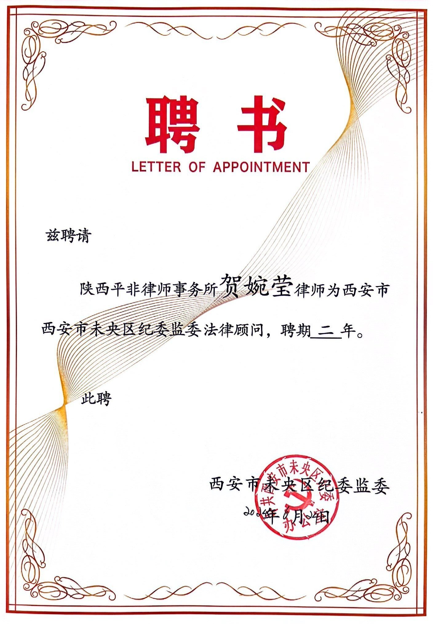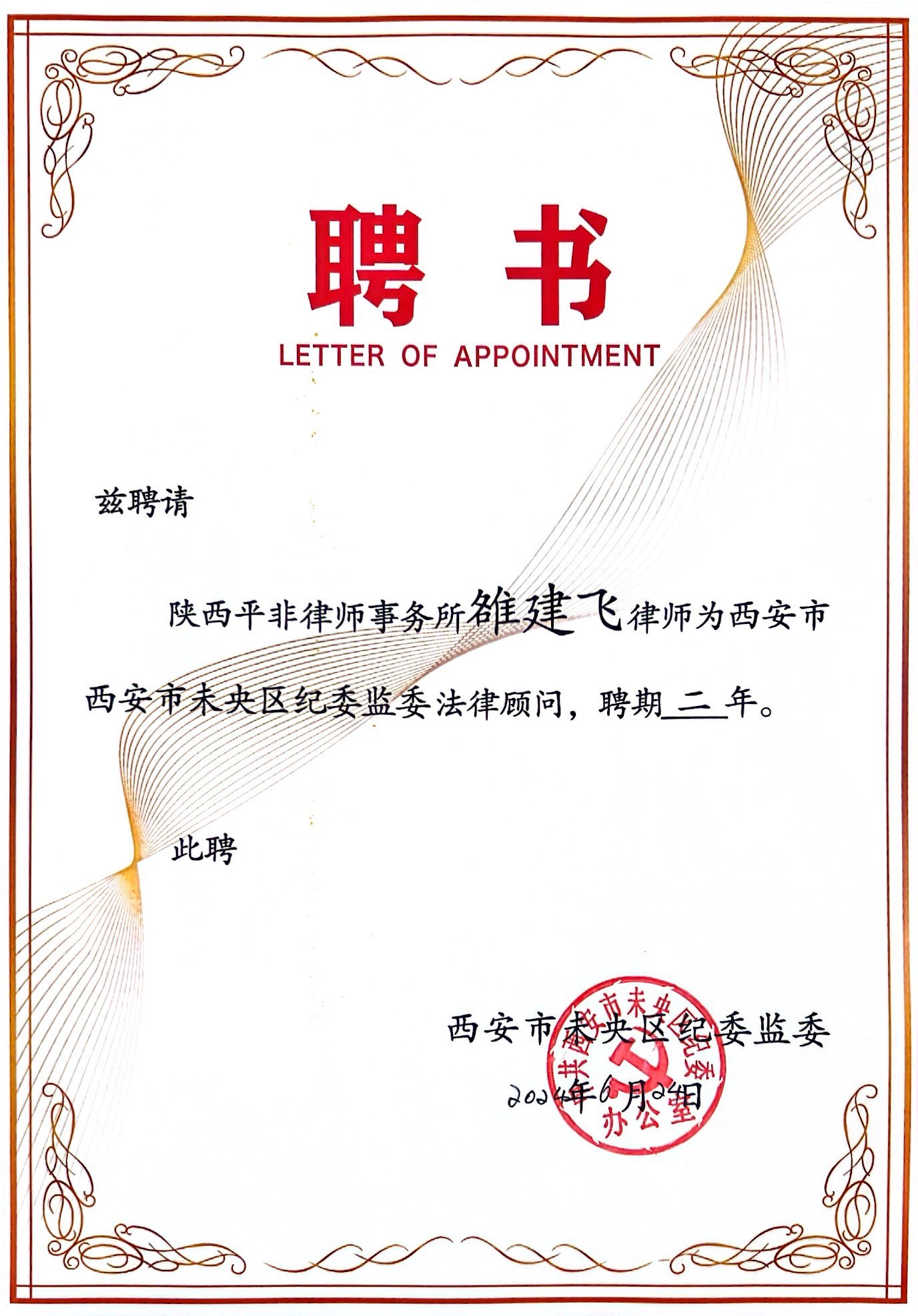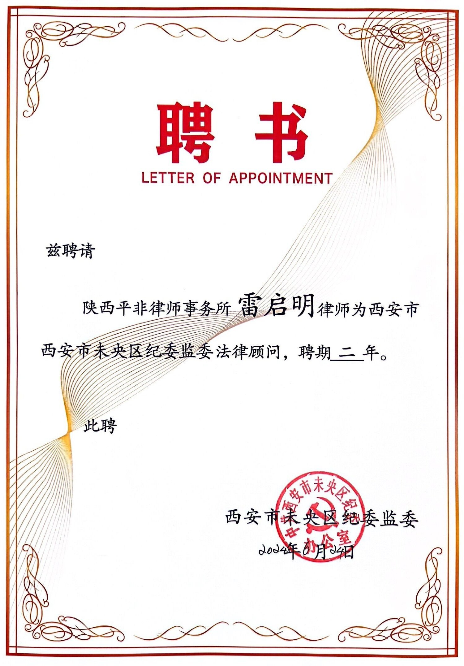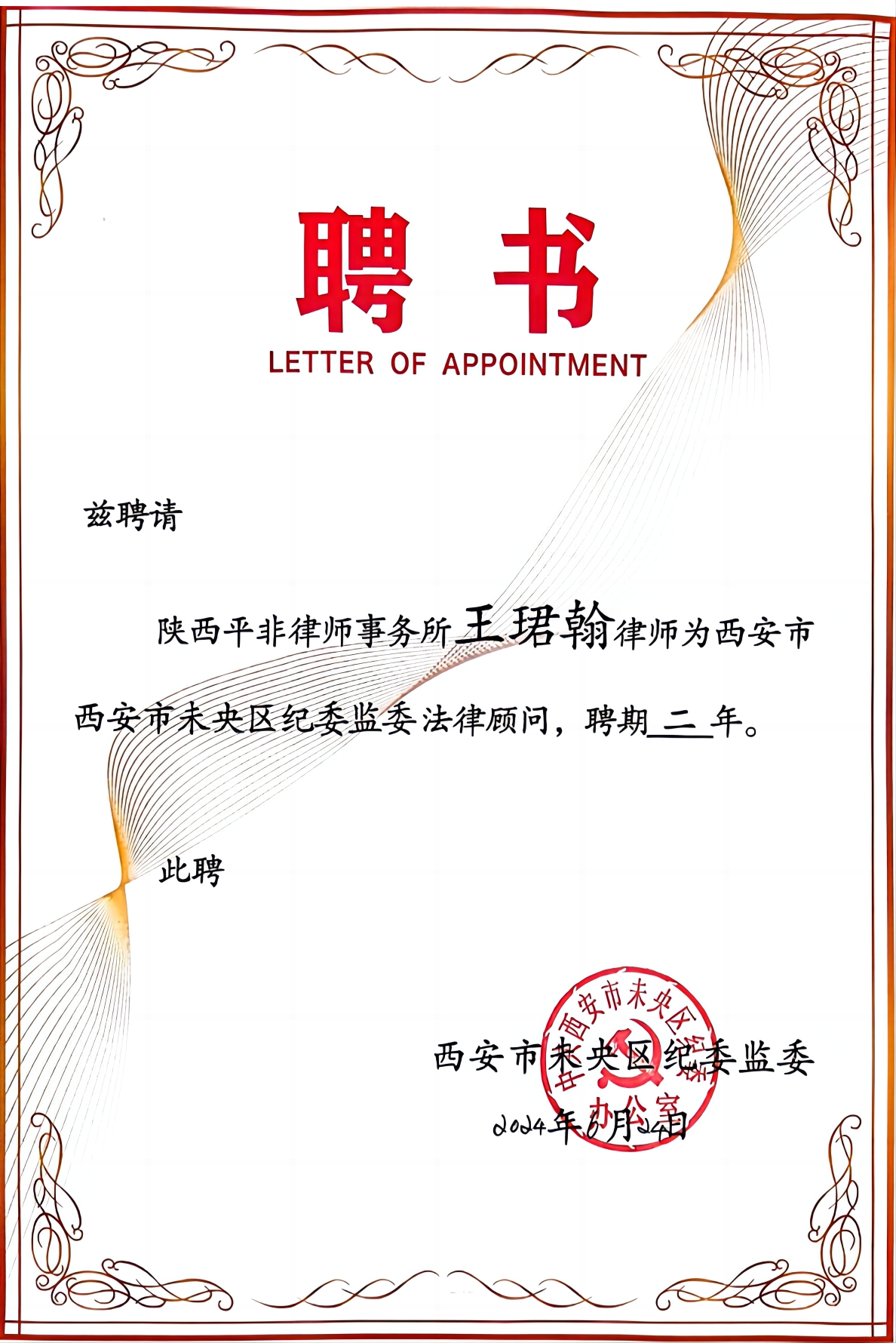 为进一步完善纪检系统决策法律咨询机制,西安市未央区纪委监委聘请我所作为常年法律顾问。我所组成顾问团队提供全方位法律顾问服务,6月24日,未央区纪委监委为受聘律师王珺翰、雷启明、雒建飞、贺婉莹颁发聘书。