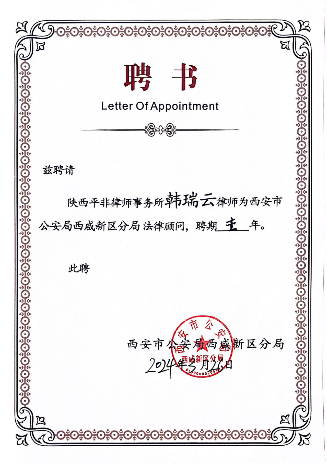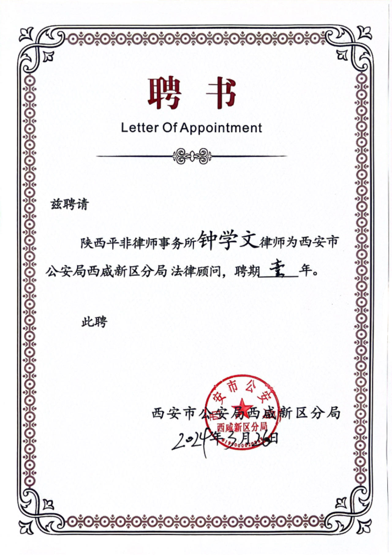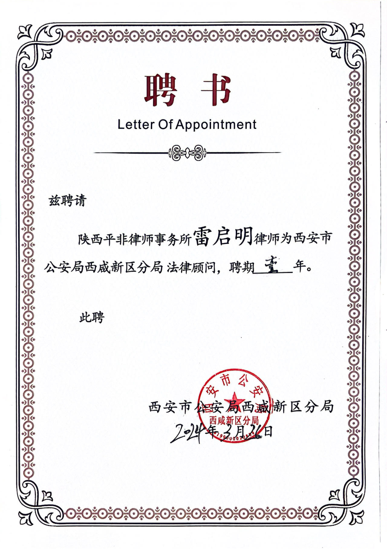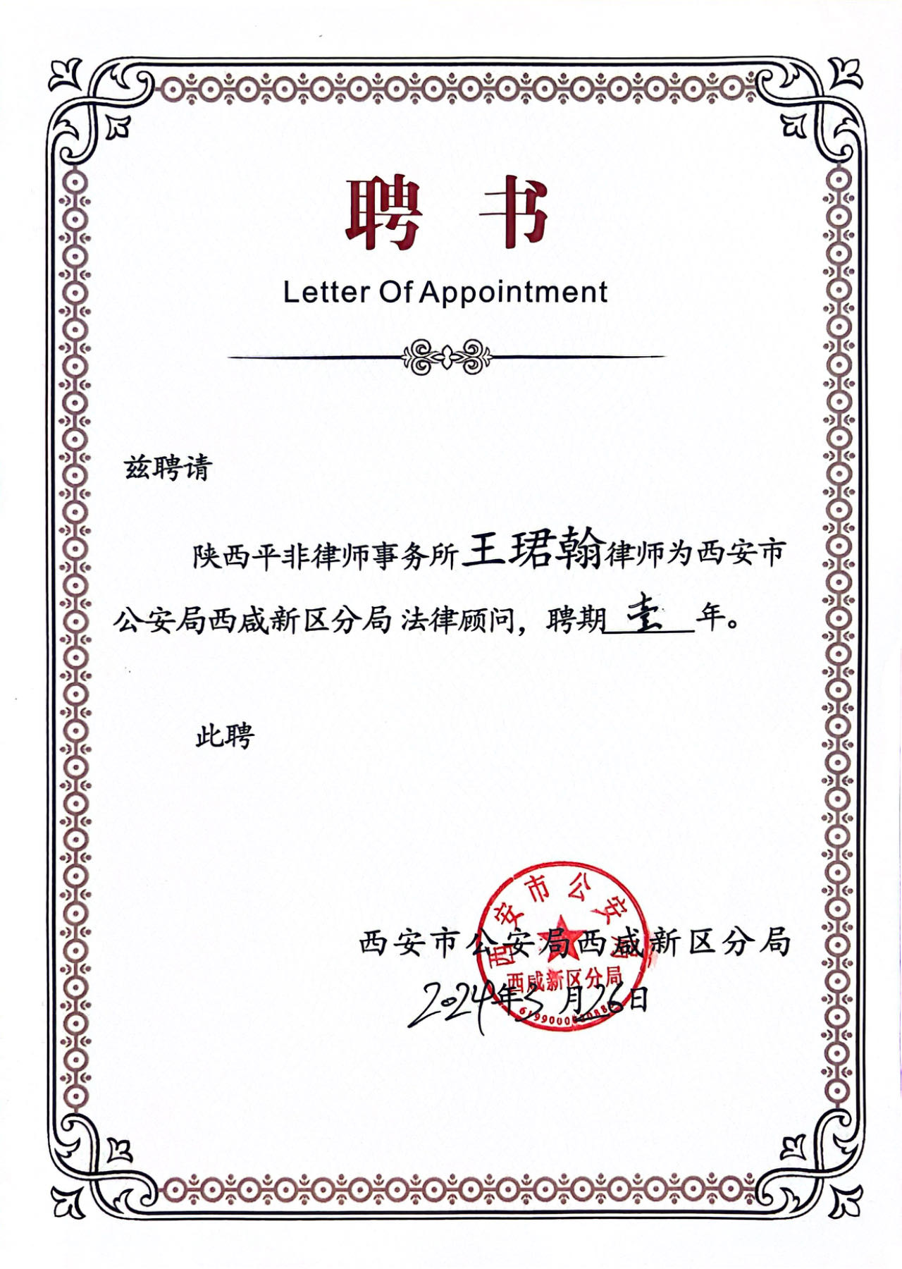 近日,西安市公安局西咸新区分局聘任陕西平非律师事务所为常年法律顾问,向我所律师王珺翰、雷启明、钟学文、韩瑞云颁发聘书。