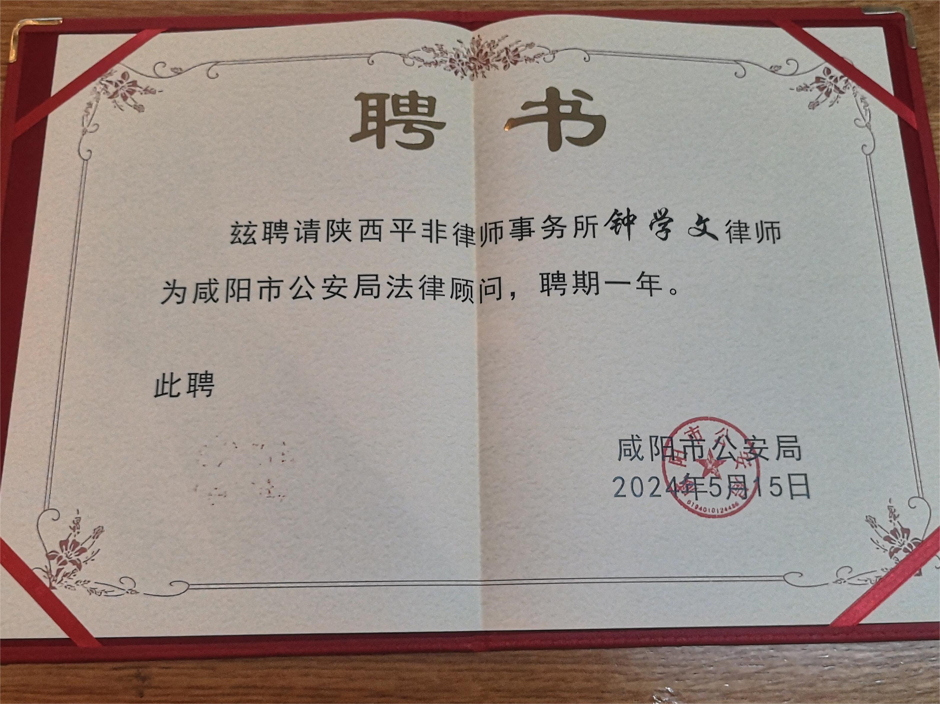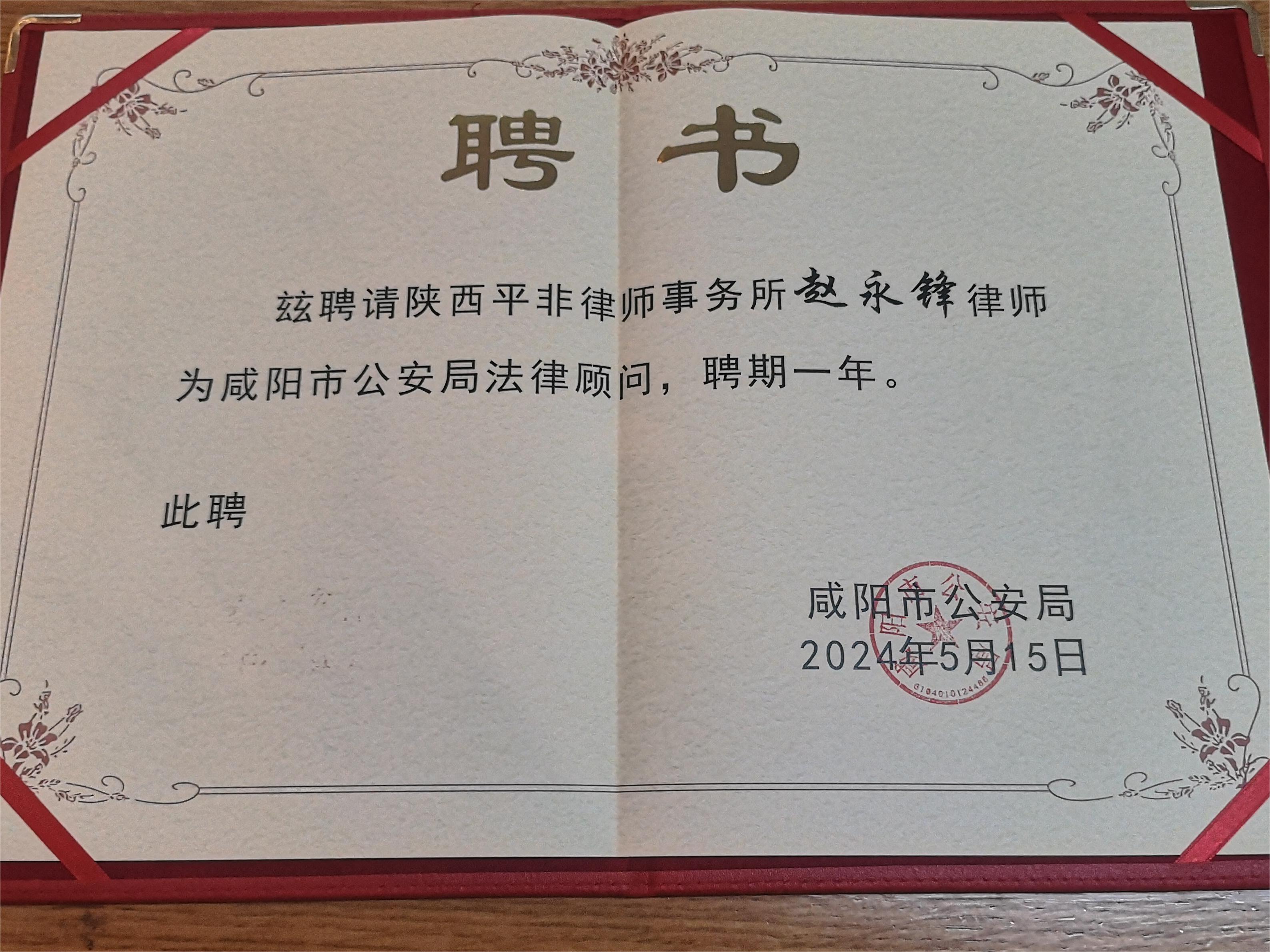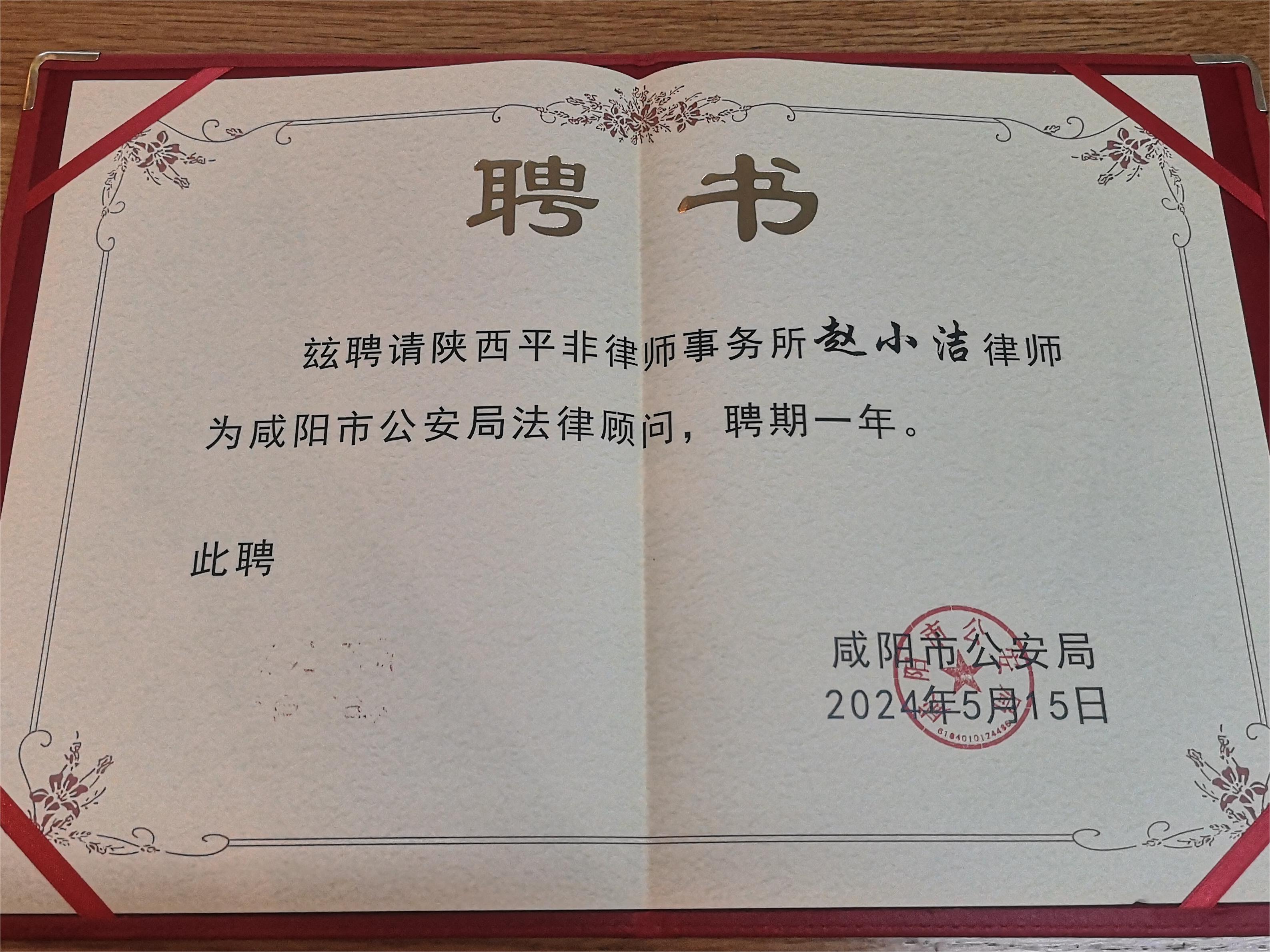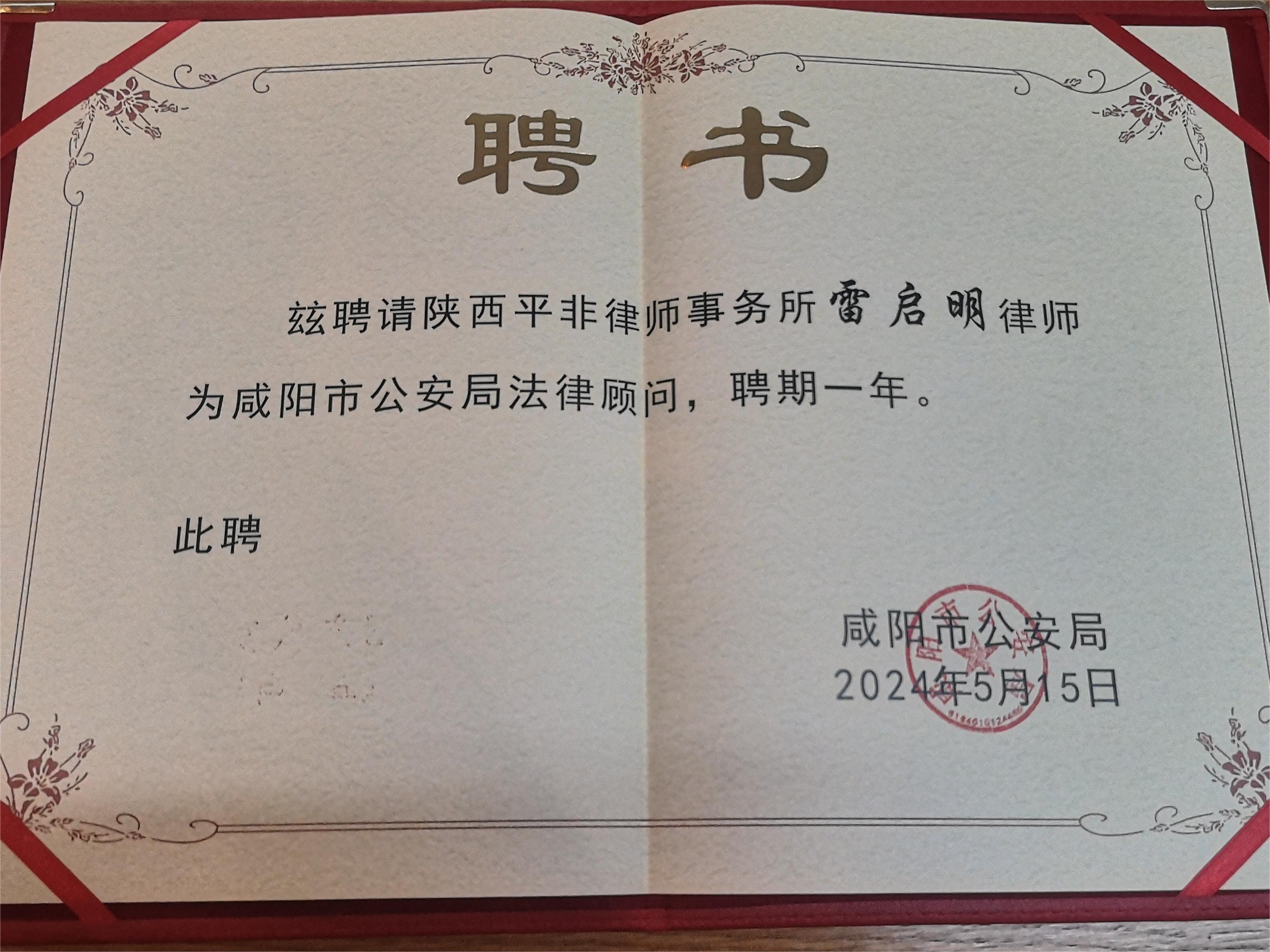 5月15日,咸阳市公安局选聘陕西平非律师事务所为常年法律顾问,由我所律师王珺翰、白啊妮、雷启明、赵小洁、钟学文、赵永锋为咸阳市公安局提供法律顾问服务。